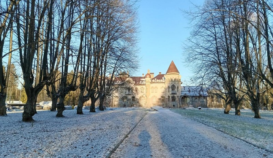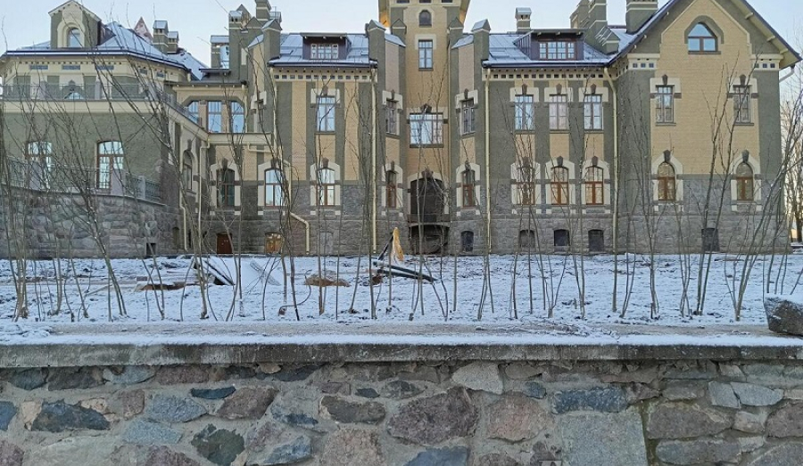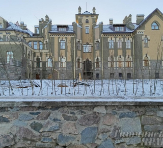 …Свернув с шоссе на Белогорку, вы окажетесь совсем рядом с усадьбой Елисеевых. Замок, стоящий в глубине парка, прячется за невыразительным зданием сельскохозяйственного института. Территория усадьбы пока обнесена глухим забором, но внутри, за воротами, открывается живая иллюстрация к сказке Шарля Перро про спящую красавицу: вот аллея из вековых лип, которая ведет к прекрасному замку. Под лучами полуденного зимнего солнца он кажется бледно-розовым… Игре воображения не мешают ни остатки строительных материалов, ни экскаватор как часть пейзажа. Ландшафтные работы еще не закончены, а вот сам дворец снаружи практически готов. Сейчас ведутся не видные глазу внутренние работы.