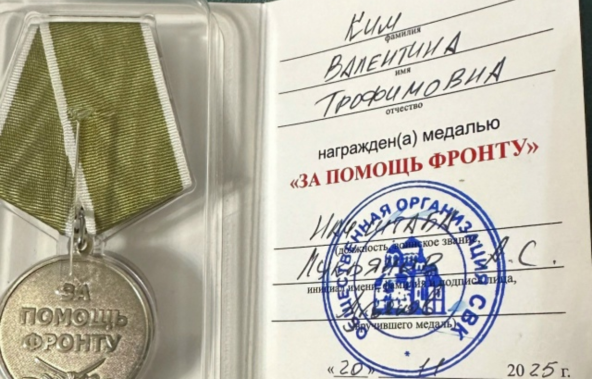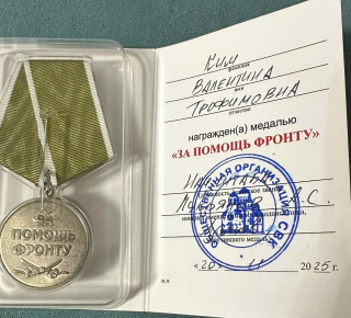 Валентина Ким награждена медалью «За помощь фронту».